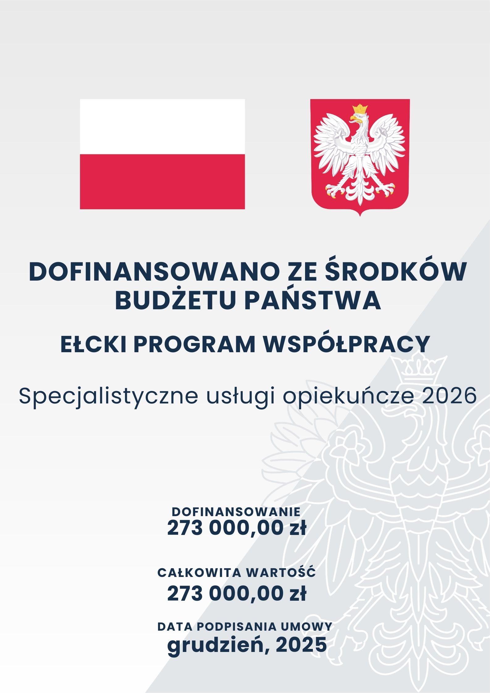 „Specjalistyczne usługi opiekuńcze 2026″ Gmina Miasto Ełk, kwota dofinansowania – 273 000,00 zł. Realizacja zadania publicznego odbywa się od 01.01.2026...
